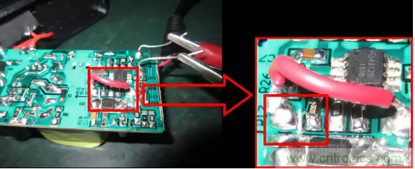 通過斷開PCB銅箔使用一根導(dǎo)線連到輸出電容地,隔開ME4312B芯片地,如下圖: