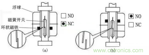 圖(a):當(dāng)水位下降時,環(huán)狀磁鐵下降,磁簧開關(guān)處于接通狀態(tài);