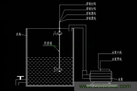 2、當(dāng)水位漲到A、B處限位開關(guān)之間時,B處開關(guān)斷開,A處開關(guān)仍然是閉合狀態(tài),此時線圈被自鎖得電,水泵繼續(xù)運行;