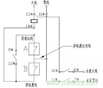 上圖中,6#與10#、7#與11#、8#與12#是繼電器常開觸點,13#與14#繼電器線圈觸點,A和B分別是雙浮球的上下限位開關(guān)。該電路只有當(dāng)水位下降至最低限位之后才會工作。