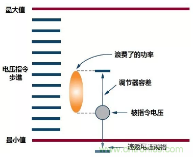 問(wèn)題是大多數(shù)電源調(diào)節(jié)器都不夠準(zhǔn)確。調(diào)節(jié)電壓可以在被指令電壓附近的公差范圍內(nèi)的任何地方,并且它可以隨負(fù)載條件、溫度和老化而漂移。±2%容差的電源即表示可以在4%的電壓范圍內(nèi)輸出任何值。為了補(bǔ)償電壓處于2%過(guò)低的可能性,被指令電壓必須比滿足時(shí)序所需的電壓提高2%。如果經(jīng)過(guò)調(diào)節(jié)器后電壓漂移到高于被指令電壓2%處,它將比該工作點(diǎn)所需的最小電壓運(yùn)行高4%。這仍然符合規(guī)定的FPGA所需的電壓要求,卻浪費(fèi)了大量功率,如下圖2所示。