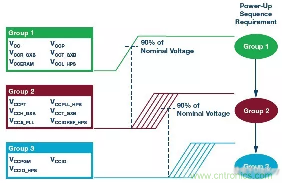 市場(chǎng)中較新的FPGA在規(guī)格中會(huì)提供針對(duì)啟動(dòng)和關(guān)斷電源時(shí)的序列順序提出特定的要求,確保FPGA正常開(kāi)啟及復(fù)位,保持最小的電流消耗,并在電源轉(zhuǎn)換期間將I/O保持在正確的三態(tài)配置下。再以Arria 10為例,其技術(shù)規(guī)格將電源分為三個(gè)序列組(1、2、3),并要求它們按升序排列為1、2、3,然后按相反的順序降序排列:3、 2、1。