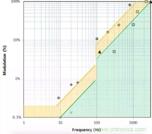 電氣和電子工程師協(xié)會1789-2015年標準首次提出降低人體健康風險的全面建議。上圖顯示的是對人體健康風險較低或無明顯風險(綠色部分)的整個頻率范圍內(nèi)的頻閃限值曲線?! ?/div>