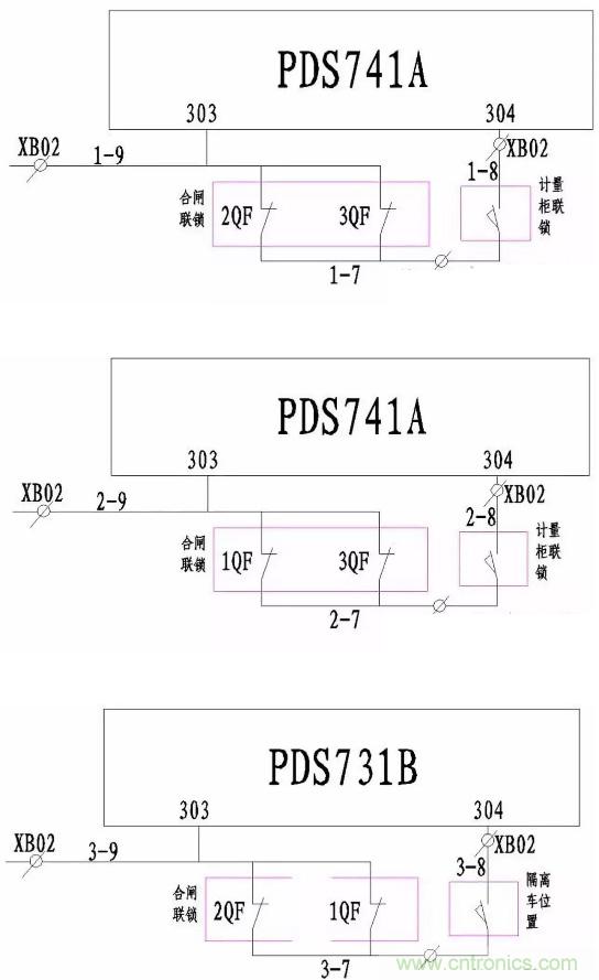 在計量柜與母聯(lián)隔離柜都到位的情況下,合1QF與2QF。這時PDS731B的3-7與3-9處于分斷的狀態(tài),其304端子無電源,3QF不滿足合閘條件。同理,1QF與3QF合閘時,2QF不滿足合閘條件;2QF與3QF合閘時,1QF不滿足合閘條件。