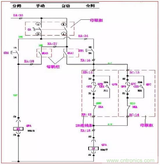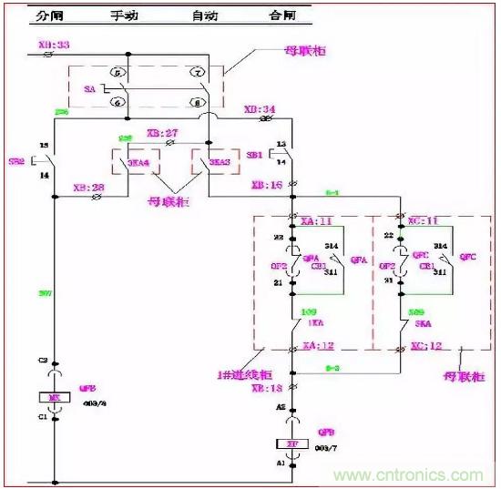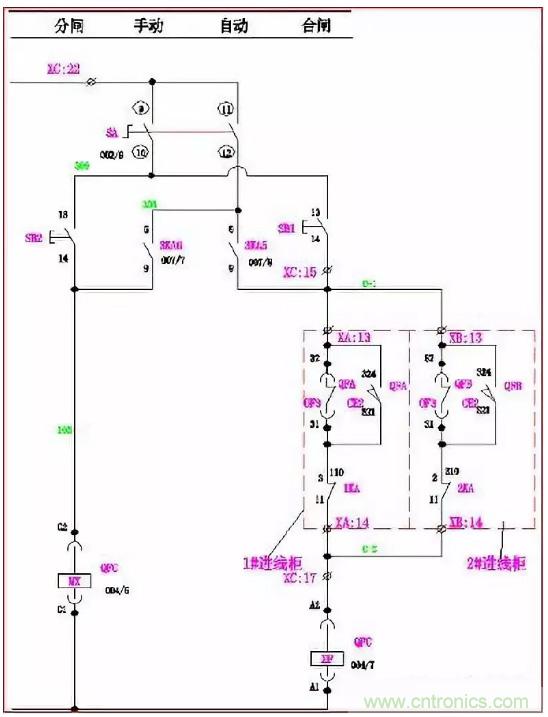 手動時:當QFA、QFB合閘,QFC合閘回路C-1、C-2斷開,其合閘線圈XF無法得電, QFC不能滿足合閘條件;同理,當QFA、QFC或QFB、QFC同時合閘時,QFB或QFA也同樣不能滿足合閘條件。使進線柜與母聯(lián)滿足“三合二”邏輯。