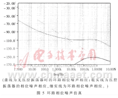 可見分頻式鎖相環(huán)路對(duì)于輸入信號(hào)、分頻器、檢相器的附加相位噪聲呈低通特性,對(duì)于壓控振蕩器的相位噪聲呈高通特性。環(huán)路相位噪聲仿真結(jié)果與該結(jié)論相符,見圖5。與普通倍頻器件相似,“低通型”的噪聲通過(guò)分頻鎖相環(huán)會(huì)增加N2倍,輸入?yún)⒖夹盘?hào)來(lái)自穩(wěn)定信源,其信噪比較高,而分頻器輸出端很小的近旁頻信號(hào)在經(jīng)過(guò)