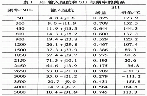 變壓器初級的一端內部和地連接,如果RF源有DC電壓,則在其輸入端接入耦合電容器。在1.7GHz~3 GHz之間,RF輸入可由內部匹配,在這個頻率范圍不需要外部匹配。頻帶邊沿輸入回波損耗的典型值為10 dB。