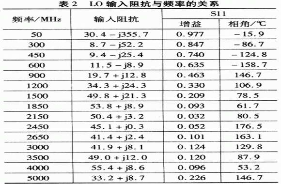 頻率大于1.2 GHz時,盡管放大器提供的功率有幾個dB,但最佳LD驅動功率只有-3 dBm(I/0輸入功率變化,混頻器性能不變);在頻率低于1.2GHz的情況下,盡管-3 dBm的L0驅動功率仍然提供高轉化增益和線性,但是為了得到最佳噪聲,LO驅動功率為0 dBm。自定義匹配網絡的阻抗數(shù)據見表2,并參考LO端沒有匹配時的情況。