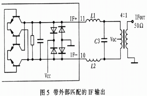 圖3示出由混合變壓器構成的lF匹配電路,以達到最低LO-IF泄漏和最寬的IF帶寬。圖4示出由1個離散的IF不平衡變壓器代替IF變壓器的電路,以降低成本和縮小尺寸,盡管離散的IF不平衡變壓器也有較理想的噪聲系數(shù)、線性度及較高的轉換增益,但是LO-IF泄漏降低,IF的帶寬減小。