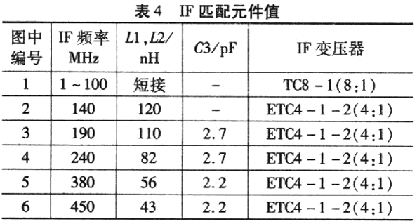 該匹配網絡對40MHz以上(包括40MHz)的IF最為合適。對于40 MHz以下的IF頻率,若串聯(lián)電感器(Ll、L2)的電感值取得過高,用這樣的電感和寄生效應將影響穩(wěn)定性,因此,8:1變壓器適合于低IF頻率。適用于 IF頻率的低通濾波的匹配元件值如表4所示。高Q值線繞片式電感器(Ll、L2)大大改善了混頻器的轉換增益,但對線性度還是有點影響。