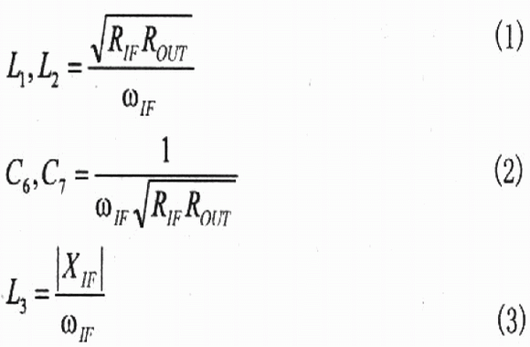 在許多應用中,可以用離散IF不平衡變壓器代替IF變壓器,如圖4所示。Ll、L2、C6和C7的值可用式(1)、式(2)計算,在IF頻率期望值上得到 180°相移,并提供50Ω的單端輸出。電感器L3的值也可計算,但L3抵消內部2.5pF的電容器,L3也為IF+端提供偏置電壓。低功耗多層片式電感適合Ll、L2,為了得到最大轉換增益以及為IF+端提供最小DC電壓,L3選用高Q值線繞片式電感器,C3是DC的隔離電容器。