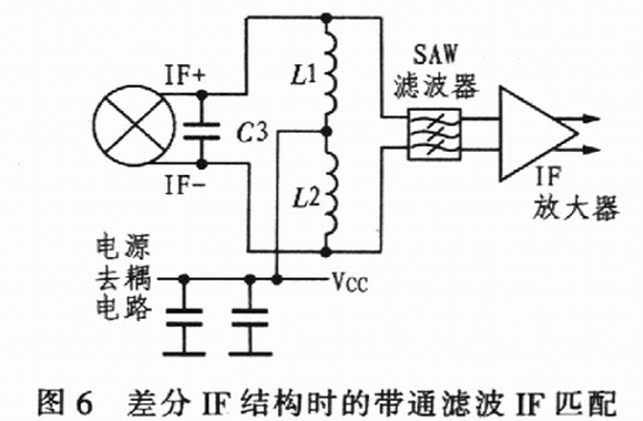 對整個差分IF結構來說,還可以從另一個角度考慮,不用IF變壓器,如圖6所示,這里,混頻器的lF輸出匹配直接通過1個SAW濾波器,混頻器IF端的電源由IF匹配網絡中的電感器提供。計算Ll、L22和C3的值,使之在期望的IF頻率上諧振,并獲得高品質因數(shù)和理想帶寬。調整L和C值,以消除混頻器內部2.5 pF電容和SAW濾波器輸入電容的影響。在這種情況下,由于帶通網絡不變換阻抗,其差分lF輸出阻抗是400Ω。若SAW濾波器的輸入阻抗大于或小于 400 Ω,就需要附加匹配元件。