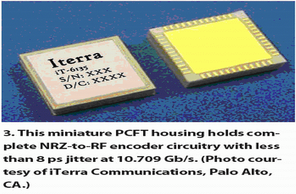 iTerra是另一家廣泛采用PCTF封裝技術(shù)的公司,該公司主要生產(chǎn)高端微波器件以及高速數(shù)字、光纖通訊網(wǎng)絡(luò)產(chǎn)品。iTerra生產(chǎn)的10.709 Gb/s NRZ(不歸零)到RZ(歸零)編碼器,采用了高氣密型(1×10-8 cm2/s)無引腳陶瓷PCTF封裝,能有效地散發(fā)出其5瓦的功耗,該模塊集成度高,電路密度大(圖3)。采用PCTF封裝,配上阻抗匹配電路,該模塊可以保證較寬溫度范圍內(nèi)的信號(hào)完整性(小于8ps的抖動(dòng))。
