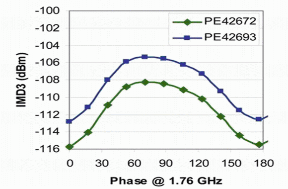 針對(duì)這個(gè)需求,業(yè)界開(kāi)發(fā)出了SP7T開(kāi)關(guān)來(lái)支持具有1個(gè)WCDMA和4個(gè)GSM頻段的手機(jī)架構(gòu)。例如PE42672就是采用UltraCMOS工藝技術(shù)開(kāi)發(fā)的單片SP7T,它能提供+68dBm的三階交調(diào)截取點(diǎn)(IP3),這個(gè)線性度性能值可以滿足3GPP IMD3規(guī)范兼容的手機(jī)設(shè)計(jì)和高效的射頻前端要求。IP3與設(shè)備的三階交調(diào)失真(IMD3)性能相互關(guān)聯(lián),這些相位上的指標(biāo)如圖1所示。