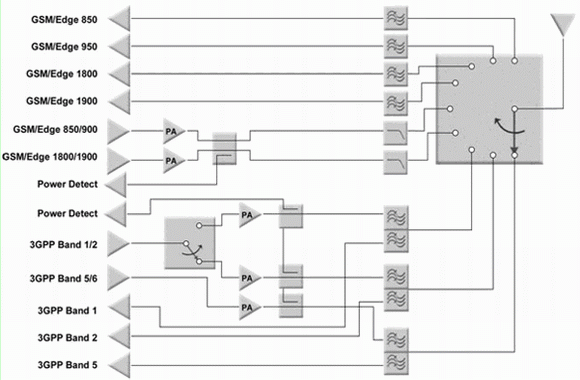 隨著多頻段架構(gòu)的普及,對(duì)功放和相關(guān)濾波器的數(shù)量提出了嚴(yán)格的要求。事實(shí)上,對(duì)功放的技術(shù)要求沒(méi)有變化,但手機(jī)設(shè)計(jì)需要使用更多的功放。因此真正改變的是需要一個(gè)特別高效的方法將所有射頻信號(hào)傳送給天線-單片開(kāi)關(guān)。