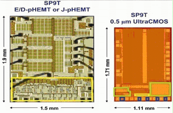 隨著多頻段手機(jī)越來(lái)越流行,對(duì)高集成度、小型天線開(kāi)關(guān)的需求也越來(lái)越迫切。UltraCMOS SP7T開(kāi)關(guān)現(xiàn)在已經(jīng)開(kāi)始批量生產(chǎn),SP9T也在2007年底投入批量生產(chǎn)。在外形方面,GaAs SP7T為1.6x1.5mm,而采用SOS工藝SP7T開(kāi)關(guān)只有1.2x1.0mm,面積縮小了一半。目前的GaAs E/D pHemt或J-pHemt SP9T開(kāi)關(guān)外形尺寸為1.9x1.5mm。與之相比,采用UltraCMOS 0.5μm工藝制造的SP9T外形尺寸為1.7x1.1mm(圖3),它不需要片外ESD器件和性能增強(qiáng)匹配器件。UltraCMOS發(fā)展規(guī)劃預(yù)計(jì)0.25μm版本的SP9T尺寸將達(dá)到1.32x1.29mm。