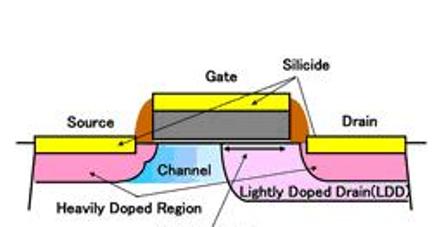 1.“低摻雜漏極”(LDD)區(qū)包圍該晶體管的漏極,并與門極重疊。這一結構既能降低水平擴展至漏極的電場,也能降低垂直擴展至門極氧氣層的電場,從而增加了擊穿電壓。