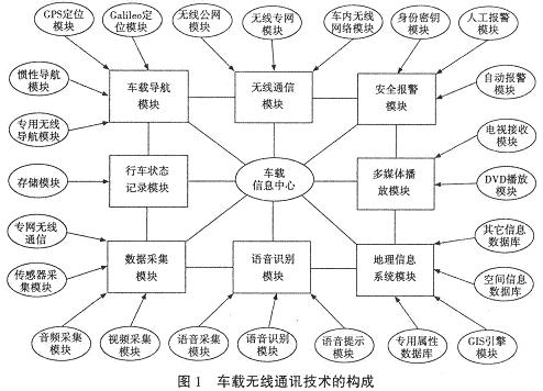 車載無(wú)線通訊技術(shù)由車載導(dǎo)航模塊、車載無(wú)線通信模塊、安全報(bào)警模塊、行車狀態(tài)記錄模塊、多媒體播放模塊、數(shù)據(jù)采集模塊、語(yǔ)音識(shí)別模塊、地理信息系統(tǒng)模塊八部分組成。所有的數(shù)據(jù)都通過(guò)車載信息中心進(jìn)行處理、協(xié)調(diào),并作出正確的反應(yīng)。圖l為車載無(wú)線通訊技術(shù)的構(gòu)成。