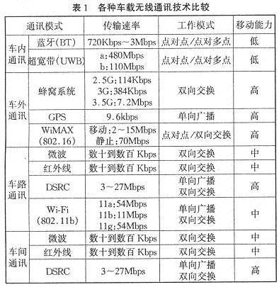 表1列出了四種模式下各種車載無(wú)線通訊技術(shù)的比較。