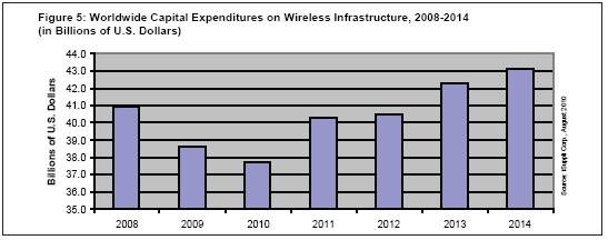 預(yù)計(jì)2011年全球無(wú)線基礎(chǔ)設(shè)施上面的資本支出預(yù)計(jì)達(dá)到403億美元,逆轉(zhuǎn)2009年開始的下滑態(tài)勢(shì),今年將繼續(xù)增長(zhǎng)。2009年支出下降5.7%,2010年將下降2.3%至378億美元。
