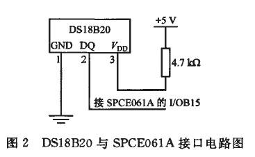 溫度檢測單元采用D1S8B02型傳感器,是美國DALLAS公司推出的一種改進(jìn)型智能溫度傳感器,與傳統(tǒng)的熱敏電阻等測溫元件相比,它能直接讀出被測溫度,并且可根據(jù)實際要求通過編程實現(xiàn)9~12位的數(shù)字值讀數(shù)方式。DS18BZo與SPCEo61A單片機(jī)的接口電路如圖2所示,由于DS18B20傳感器支持“一線總線”接口,因此只需將DS18B20信號線接到單片機(jī)的1位1/0線上即可,而且在1根1/0線上可以掛接多個傳感器實現(xiàn)多點溫度測量。