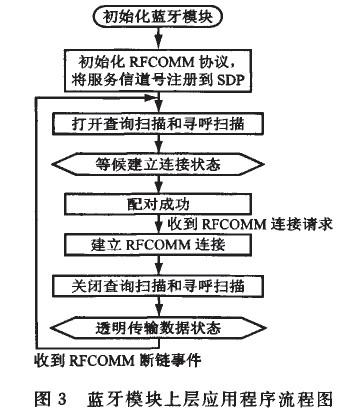 本系統(tǒng)是基于藍(lán)牙的串口應(yīng)用模型SPP(SerialPortProfile)實現(xiàn)無線數(shù)據(jù)的透明傳輸,在核心協(xié)議棧之上編寫自己的上層應(yīng)用程序。CSR的藍(lán)牙核心協(xié)議棧包括HCI、LZCAP、SDP、RFCOMM等,以固件的形式提供給開發(fā)人員,用戶編寫的應(yīng)用程序和協(xié)議棧一起運行在CSR嵌人式環(huán)境中。在CSR程序中,不同任務(wù)之間可以異步地發(fā)送消息,每一個任務(wù)在創(chuàng)建的時候可以讓其中一個擁有消息隊列,其它的就把發(fā)給任務(wù)的消息提交給該消息隊列,由任務(wù)調(diào)度程序自動運行獲得任務(wù)的消息。藍(lán)牙模塊上層應(yīng)用程序流程如圖3所示。