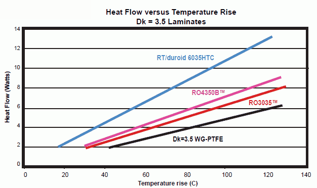 由于很多系統(tǒng)(包括商業(yè)通信和戰(zhàn)術(shù)軍事系統(tǒng))都需要具有高可靠性和穩(wěn)定的電氣性能,電路板材料供應(yīng)商近年來(lái)非常關(guān)注熱管理問(wèn)題,開發(fā)出的材料不僅能夠處理類似功率放大器等電路中的較高功率級(jí),而且在高溫下不會(huì)發(fā)生電氣性能改變。例如,Rogers Corporation公司最近發(fā)布的RT/duroid 6035HTC電路材料就是一種陶瓷填充PTFE復(fù)合材料,其導(dǎo)熱率高達(dá)1.44 W/m/K,是標(biāo)準(zhǔn)FR-4型電路板材料的好幾倍(見圖1)。這種材料整合了穩(wěn)定的機(jī)械與電氣性能以及導(dǎo)熱性能,因此可作為高頻功率放大器的理想材料。