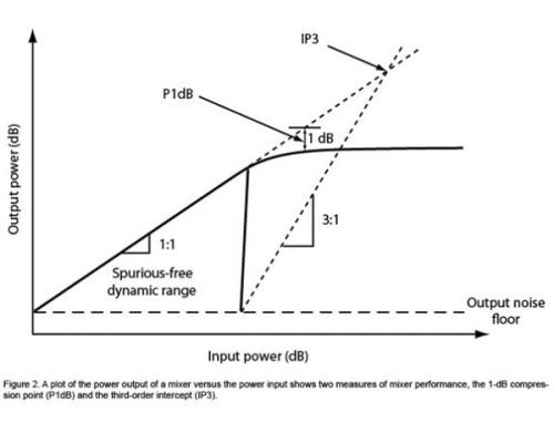 在標(biāo)準(zhǔn)或線性工作條件下,混頻器的變頻損耗是恒定的,與RF功率無關(guān)。這意味著,當(dāng)你以1dB的幅度增加輸入功率時(shí),輸出功率也會(huì)以1dB遞增。在P1dB壓縮點(diǎn),輸入功率增加,以便輸出不隨輸入功率線性增加。這也是混頻器變頻損耗高出理想值1dB的原因(圖2)。