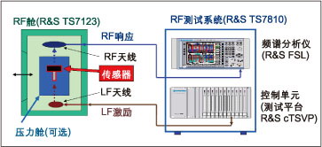 壓力艙模擬RF測試艙內部的胎壓。一個波形發(fā)生器以125kHz LF數(shù)據(jù)電報激勵胎壓傳感器發(fā)送數(shù)據(jù)(ID號碼、壓力和溫度)。該RF數(shù)據(jù)電報由測試艙中的ISM天線拾取并在頻譜分析儀中解調。其系統(tǒng)軟件可評估該信息并給出GO/NoGo信息。