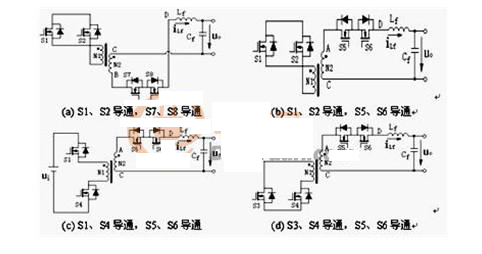 讓周波變換器的功率開關(guān)S5與S7(S6與S8)之間存在換流重疊導(dǎo)通時(shí)間、S5與S6(S7與S8)按濾波電感電流iLf極性選擇導(dǎo)通,從而使得該控制方案具有如下優(yōu)點(diǎn):1、周波變換器換流重疊期間實(shí)現(xiàn)了變壓器漏感能量的自然換流,實(shí)現(xiàn)了功率器件的零電流開關(guān);2、實(shí)現(xiàn)了濾波電感電流的自然續(xù)流;3、iLf極性選擇信號的引入避免了換流重疊期間周波變換器中的環(huán)流現(xiàn)象;4、每個(gè)開關(guān)周期內(nèi)兩次交流側(cè)的能量回饋實(shí)現(xiàn)了逆變橋所有功率器件的零電壓開通[5]。