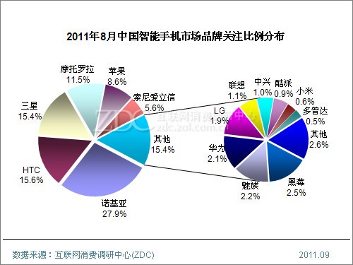 (圖)2011年8月中國(guó)智能手機(jī)市場(chǎng)品牌關(guān)注比例分布