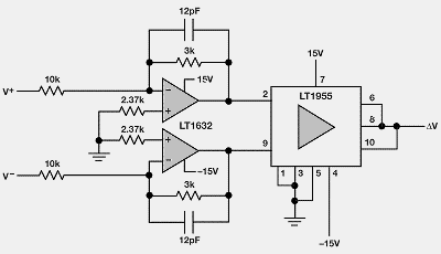 盡管共模信號(hào)(H橋的電源電壓)很大,由于這些放大器具有高共模抑制特性,因此仍可精確測(cè)量電壓和電流。LT1632逆變器將電壓信號(hào)衰減至LT1995的輸入共模范圍內(nèi)。共同使用LT1632s和LT1995產(chǎn)生的輸出電壓ΔV是負(fù)載電壓的0.1倍。