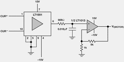 LT1995和LT1991精密增益放大器用不同方式測(cè)量電機(jī)的電壓和電流(分別為圖1和圖3所示)。