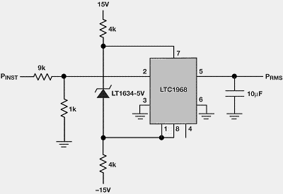 瞬時(shí)功率波形衰減十倍,并輸入到LTC1968,這樣直流輸出與RMS功率成正比(圖5)。