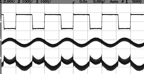 圖6a: PWM驅(qū)動(dòng)占空比為60%的功率測(cè)量電路波形、0.1感應(yīng)電阻和小電機(jī)電阻。軌跡1為電壓,軌跡2為電流,軌跡3為瞬時(shí)功率。