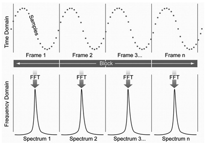 上一層是幀,幀由整數(shù)個(gè)連續(xù)樣點(diǎn)組成,是可以應(yīng)用快速傅立葉變換(FFT)把時(shí)域數(shù)據(jù)轉(zhuǎn)換到頻域中的基本單位。在這一過(guò)程中,每個(gè)幀產(chǎn)生一個(gè)頻域頻譜。