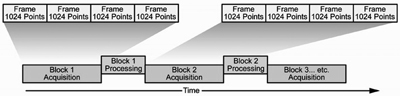 圖5是塊采集模式,可以實(shí)現(xiàn)實(shí)時(shí)無(wú)縫捕獲。對(duì)塊內(nèi)部的所有幀,每個(gè)采集在時(shí)間上都是無(wú)縫的。在一個(gè)采集塊中的信號(hào)處理完成后,將開(kāi)始采集下一個(gè)塊。塊存儲(chǔ)在內(nèi)存中,可以應(yīng)用任何實(shí)時(shí)測(cè)量。例如,實(shí)時(shí)頻譜模式下捕獲的信號(hào)可以在解調(diào)模式和時(shí)間模式下分析。