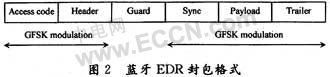 藍(lán)牙v2.0 EDR封包先在存取碼和標(biāo)頭的部分使用GFSK調(diào)變模式,但是,在保護(hù)時(shí)間5μs之后,負(fù)載部分則用π/4-DQPSK或8DPSK調(diào)變模式,如圖2所示。在保持指定的1 Ms/s符號(hào)速率前提下,增強(qiáng)速率分別提升資料速率到2 Mb/s或3 Mb/s,即每個(gè)符號(hào)發(fā)射二到三位碼元。通過測試發(fā)現(xiàn)結(jié)果,在封包的GFSK調(diào)變部分振幅顯得相當(dāng)固定,但在DPSK調(diào)變波形中振幅卻有較大的波動(dòng)。