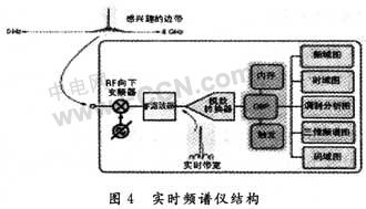 隨著數(shù)字射頻技術(shù)的發(fā)展,要求必須能捕獲并存儲(chǔ)一段時(shí)間的信號(hào),并可反復(fù)回放,分析信號(hào)隨時(shí)間的變化。另外,隨著頻譜利用率不斷提高,干擾將來自更臨近的頻點(diǎn),甚至同一頻率,這要求頻譜測試技術(shù)在發(fā)現(xiàn)和捕獲能力上實(shí)現(xiàn)本質(zhì)性的突破。實(shí)時(shí)頻譜儀的核心是基于快速傅里葉(FFT)的儀表,可以實(shí)時(shí)捕獲各種瞬態(tài)信號(hào),同時(shí)在時(shí)域、頻域及調(diào)制域?qū)π盘?hào)進(jìn)行全面分析,滿足現(xiàn)代數(shù)字射頻信號(hào)測試的需求,圖4所示為簡化的實(shí)時(shí)頻譜儀結(jié)構(gòu)圖。