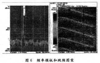 在跳頻情況下,跳頻圖案是否按照設(shè)計(jì)的跳頻圖案進(jìn)行偽隨機(jī)跳變,將直接影響到跳頻系統(tǒng)的抗干擾性能和整個(gè)設(shè)計(jì)是否成功,所以需要對(duì)跳頻圖案進(jìn)行測試驗(yàn)證。實(shí)時(shí)頻譜儀的三維頻譜圖(時(shí)間、頻率和幅度)是觀測跳頻圖案的一種非常有效的方式,如圖6所示。由于頻率模板觸圖發(fā)功能的使用,可以使得工程師直接設(shè)定跳頻的起始點(diǎn)來捕獲跳頻信號(hào)觀測跳頻圖案,這樣就可以找到特定頻率位置的跳頻圖案。而對(duì)于傳統(tǒng)儀器只能隨機(jī)捕獲,很可能無法捕獲到關(guān)心的跳頻點(diǎn)位置的跳頻圖案。