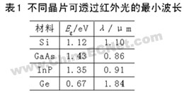 光波的近紅外部分(波長(zhǎng)約0.75~1.5 μm)可以透過(guò)晶片,不同的晶片對(duì)紅外光的透射率不同。晶片可以透過(guò)的紅外光的最小波長(zhǎng)如表1所示。