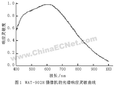 獲得的圖像質(zhì)量直接影響圖像處理程序的復(fù)雜度和檢測(cè)結(jié)果。如果采用的光源單色性越好,越接近平行光,則圖片的干涉條紋更清晰,質(zhì)量更好。然而單色激光器或者平行光源體積大,而紅外測(cè)試系統(tǒng)的一大特點(diǎn)就是結(jié)構(gòu)簡(jiǎn)單、緊湊,而提供窄波段的照明價(jià)格比較昂貴,且不易控制,因此選用普通的白熾燈作為光源。為了得到較好的紅外圖片,在鏡頭的上方放置一塊雙面鏡面拋光的硅片,從而過(guò)濾掉可見(jiàn)光對(duì)圖片的影響。同時(shí),選用超低照度黑白攝像機(jī)WAT-902H,它的光譜響應(yīng)靈敏曲線如圖1所示。而紅外線波長(zhǎng)為750 nm~1000μm,這樣我們采用普通的光源就可以獲得窄波段的紅外圖像。另外,由于該相機(jī)對(duì)紅外波段的響應(yīng)靈敏度不高,可以通過(guò)增加光強(qiáng)來(lái)克服,從而獲得清晰的紅外干涉圖像,為后續(xù)的圖像分析和處理做準(zhǔn)備。