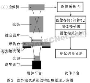 光源和CCD分別安裝在測(cè)試樣品的兩邊,相向安裝。光源的高度可調(diào),這是為了適應(yīng)測(cè)試不同晶片的要求,從而獲得最清晰的紅外圖片??勺児怅@放在鍵合片的下方,中間孔徑在Φ1.8~50 mm任意可調(diào),它控制照射到鍵合片上光斑的大小,一般調(diào)節(jié)可變光闌的內(nèi)孔徑同鍵合片大小,也可以調(diào)節(jié)到比鍵合片小,以檢測(cè)鍵合片的局部特征??勺児怅@優(yōu)化光源的同時(shí),簡(jiǎn)化了紅外圖片的背景,使得鍵合片以外的圖像為單一黑色,降低了圖像處理的復(fù)雜度,簡(jiǎn)化了系統(tǒng)軟件。