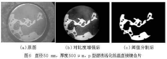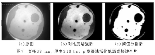 圖6(a)和圖7(a)中,圓形區(qū)域是要鍵合的圓片,其中明區(qū)為鍵合上的地方,暗區(qū)為未鍵合上的地方,圓形區(qū)域(即鍵合圓片)以外為圖像背景。從圖上可以大致地看出空洞(未鍵合區(qū)域)的分布、個(gè)數(shù)和大小等。為了獲得更為準(zhǔn)確的數(shù)據(jù)信息,借助圖像處理程序?qū)D片(a)進(jìn)行對(duì)比度增強(qiáng)、平滑、分割等一系列處理,可獲得圖(b),(c),從而得到鍵合率。樣品1的鍵合率為28.12%,鍵合率很低,并且從圖6中空洞的分布可以看出,樣品1鍵合得很不好。樣品2的鍵合率為66.12%。比較圖6和圖7,樣品2的鍵合質(zhì)量明顯優(yōu)于樣品1,可以說(shuō)明鍵合圓片越薄,越容易鍵合??梢詮钠桨謇碚摾斫膺@一鍵合現(xiàn)象,圓片越薄,界面表面能克服圓片翹曲貼合到一起所需要的力越小。