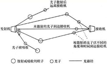 對(duì)天氣非常敏感是FSO的另一個(gè)主要問題。晴天對(duì)FSO傳輸質(zhì)量的影響最小,而雨、雪和霧的影響較大。據(jù)測試,F(xiàn)SO 受天氣影響的衰減經(jīng)驗(yàn)值分別為:晴天,5~15dB/km;雨天,20~50dB/km;雪天,50-150dB/km;霧天,50~300dB/km??梢娪绊懽畲蟮氖庆F天,這是因?yàn)殪F中的散射粒子的半徑與激光的波長在同一數(shù)量級(jí)上,而且散射粒子非常集中,從而使光線的傳播方向發(fā)生偏轉(zhuǎn),造成空間、角度和時(shí)間上的擴(kuò)展,如圖2。對(duì)于這種大氣現(xiàn)象處理的方式,與微波通信中對(duì)待雨衰相似。要在系統(tǒng)傳輸?shù)挠?jì)算中,為光信號(hào)的衰減留有足夠的系統(tǒng)功率余量,以便在出現(xiàn)濃霧最大衰減的情況下,仍能接收到所需的光信號(hào)功率。重要的是,要獲得所在地長期的氣象統(tǒng)計(jì)資料,能夠知道不同等級(jí)(能見度)的霧,即不同衰減的大氣介質(zhì)出現(xiàn)的統(tǒng)計(jì)規(guī)律。如果了解到衰減值大于某一指標(biāo)出現(xiàn)的概率,就能確定光無線系統(tǒng)為了保證可用性的指標(biāo)(比如99.9%),需要容納多大的大氣損耗。而傳輸距離的計(jì)算公式如式(1)所示。