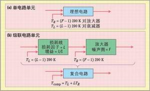 上列方程中,TR和TL分別為放大器(接收電路)和衰減器(損耗線)的有效溫度,F(xiàn)和L分別代表噪聲譜和損耗因子。圖2b是應(yīng)用于一對級聯(lián)電路元件(一條損耗線加上一個(gè)放大器)的模型,其中損耗線的增益可表示為1/L。