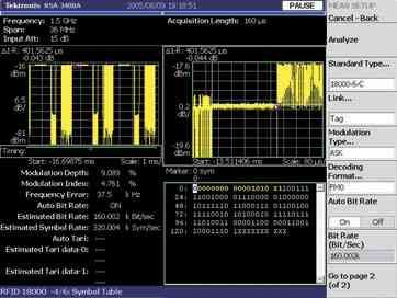 RTSA 也能解調(diào)與標(biāo)簽查詢相關(guān)的符號(hào)或比特。用戶只需選擇相應(yīng)的 RFID 標(biāo)準(zhǔn)、調(diào)制類型和解碼格式。分析儀能自動(dòng)檢測(cè)并顯示鏈路的比特率。為進(jìn)一步提高工程師的生產(chǎn)效率,對(duì)恢復(fù)出的數(shù)據(jù)符號(hào)進(jìn)行了基于功能的顏色編碼(color-coded)。RTSA 能夠自動(dòng)識(shí)別前導(dǎo)符并將那些符號(hào)染成黃色。這易于識(shí)別實(shí)際的數(shù)據(jù)負(fù)荷并與已知值進(jìn)行比較。