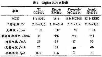 ZigBee技術(shù)是一種近距離、低功耗、低數(shù)據(jù)速率、低復(fù)雜度的雙向無線通信技術(shù),適用于無線傳感器網(wǎng)絡(luò)。目前,多家公司均有自己的主流ZigBee芯片,如表1所示。經(jīng)綜合比較,該設(shè)計(jì)選用CC2430芯片,該芯片是Chipcon公司提供的全球首款支持ZigBee協(xié)議的SoC解決方案,它在單個芯片上整合了ZigBee射頻前端、內(nèi)存和微控制器,最大27 mA的工作流耗及在休眠模式下0.9μA的流耗使之非常適合無線傳感節(jié)點(diǎn)對低功耗的要求。