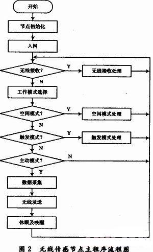 節(jié)點(diǎn)程序主流程如圖2所示,主要包括數(shù)據(jù)采集和無線通信兩個部分。出于傳感節(jié)點(diǎn)低功耗的考慮,軟件設(shè)計(jì)重點(diǎn)放在工作模式的處理上。