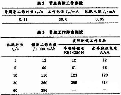 通過測試獲取節(jié)點(diǎn)工作參數(shù)如表2所示,工作電壓為3.3 V??芍?jié)點(diǎn)工作時(shí)流耗大,在休眠狀態(tài)則小得多。因此,為保證在供電電量有限的情況下獲得更長的工作壽命,有必要將節(jié)點(diǎn)設(shè)置為間歇式工作模式,即工作休眠周期性交替進(jìn)行。下式為節(jié)點(diǎn)壽命預(yù)測公式: